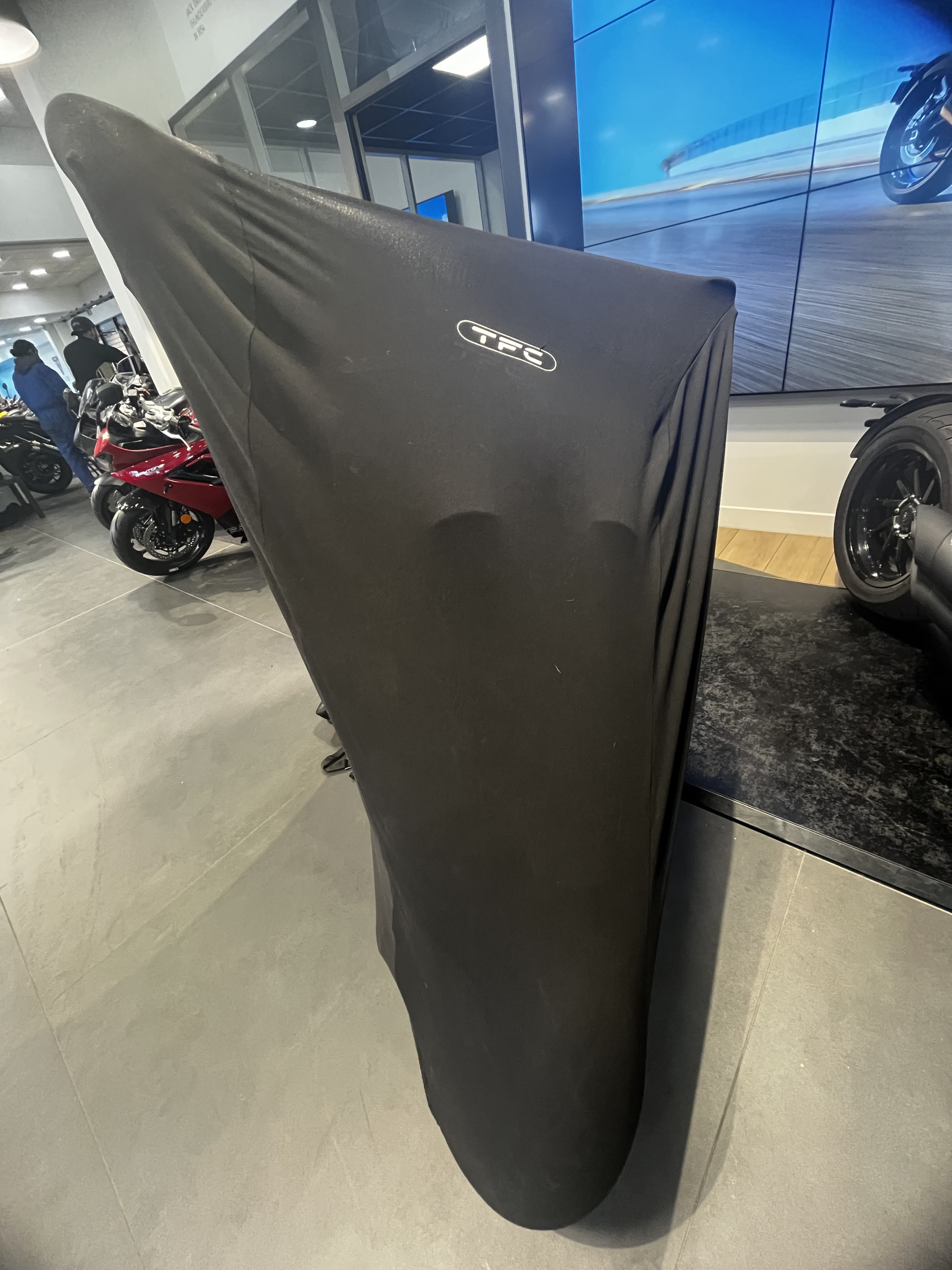 Moto équipé d'une alarme et d'un lèche roue carbone en accessoire.